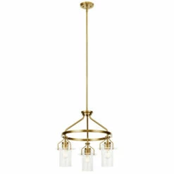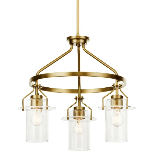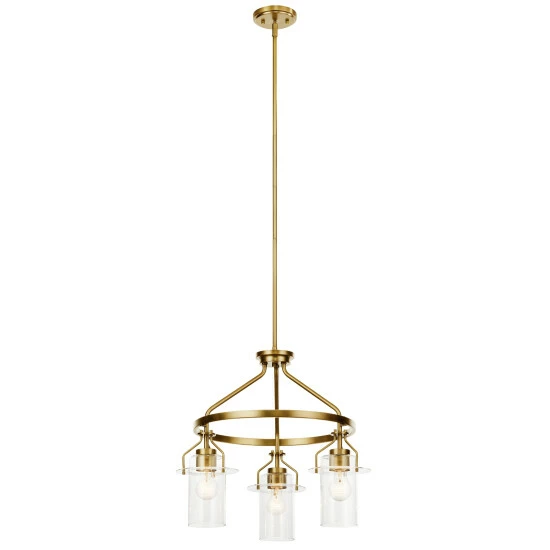 The Everett 22.75 inch 3 light chandelier adds a dash of industrial glam to your space. Three mini Clear Glass pendants are suspended from an open metal circle finished in Natural Brass. A delicate clear acrylic disc appears to hold each pendant — and your attention.
