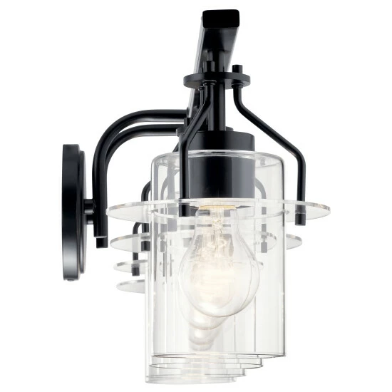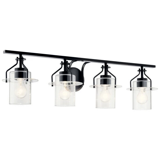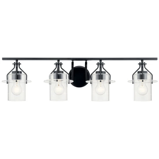 The Everett 34.25 inch 4 light vanity light adds a dash of industrial glam above your bathroom mirror. Four mini Clear Glass pendants are suspended from curved arms and a round backplate in Black. Look closely, and you’ll see delicate discs hold each pendant β and your attention.