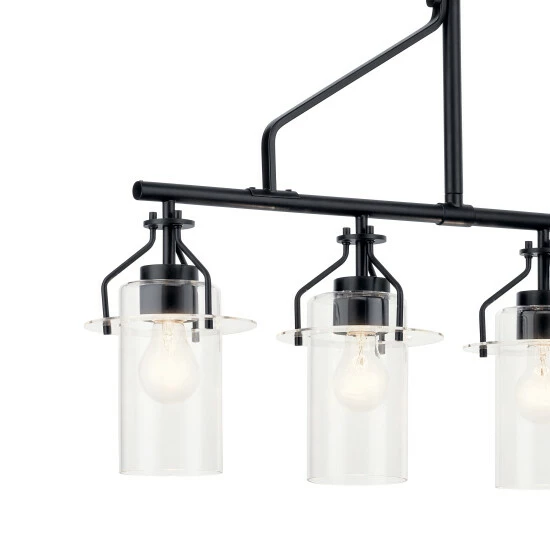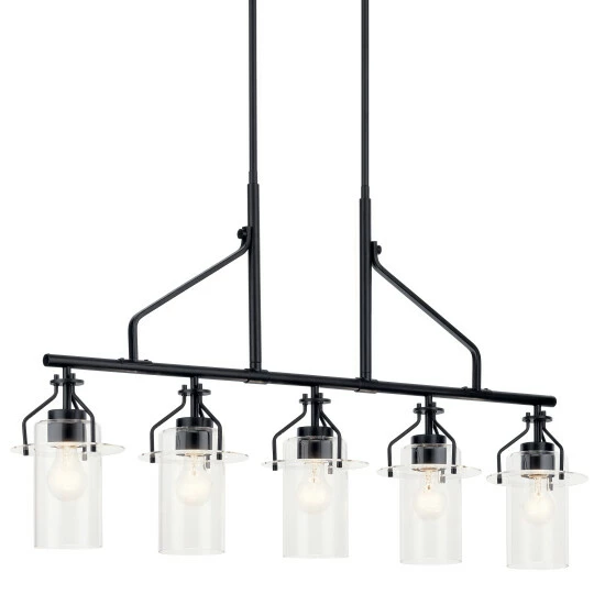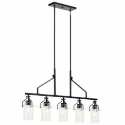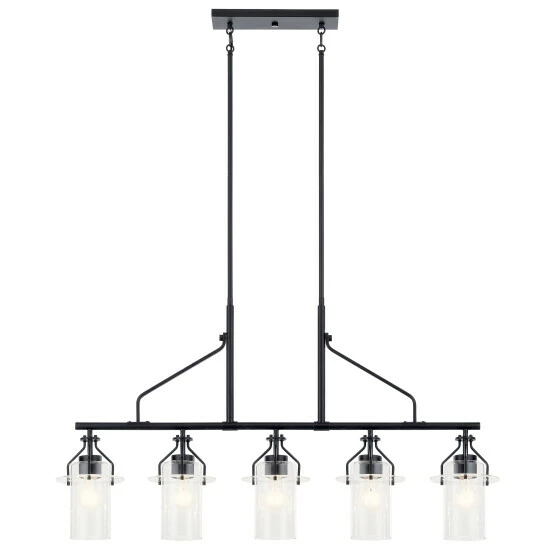 The Everett 42 inch 5 light linear chandelier adds a dash of industrial glam to your space. Five mini Clear Glass pendants are suspended from a uniquely designed Black bar. Look closely, and you’ll see delicate discs hold each pendant β and your attention.