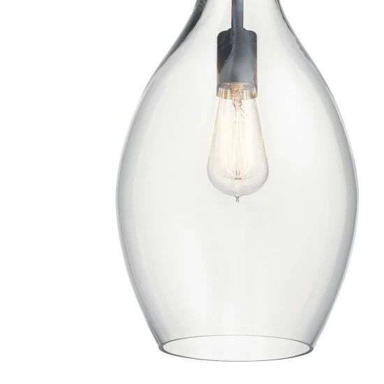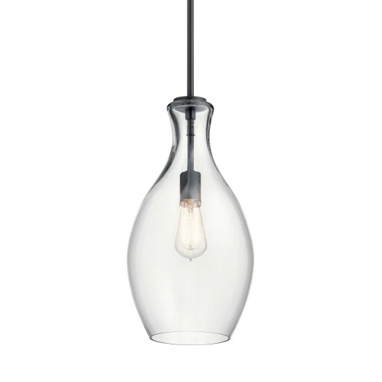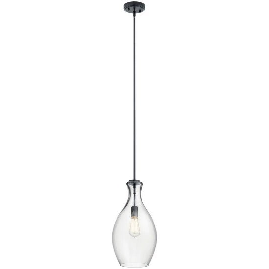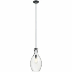 The Everly 17.75in. one light hour glass shaped pendant comes with a curved, glass blown shade featuring clear glass and a Black finish for a simple and elegant look. The Everly’s versatile design coordinates with a variety of styles and can be used singularly, in multiples or arranged at varying heights to elevate the room.