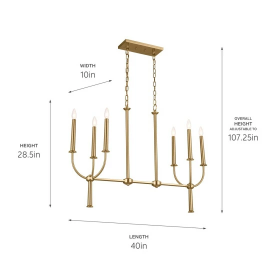 - The fixture measures 40 inches in length x 28.5 inches in height x 10 inches in width and includes stem and chains to adjust its hanging height