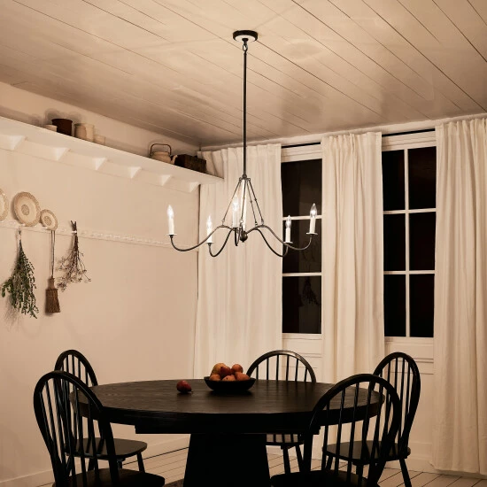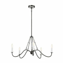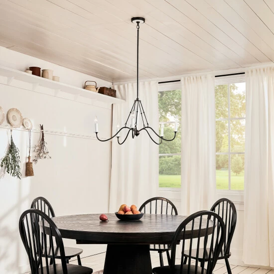 Retreat into farm-fresh simplicity with the Freesia collection. Sweeping arms, delicate detailing inspired by antique ceramics, and vintage candles make Freesia a respite from the hustle and bustle. With its delicate sweeping arms finished with fine ceramic-inspired detailing, the Freesia 5 light chandelier brings elegance with a touch of whimsy. Its refined Anvil Iron finish, White accents, and agrarian hooks invite us to relax and enjoy.