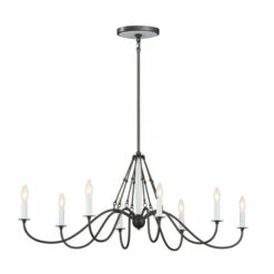 Retreat into farm-fresh simplicity with the Freesia collection. Sweeping arms, delicate detailing inspired by antique ceramics, and vintage candles make Freesia a respite from the hustle and bustle. With its delicate sweeping arms finished with fine ceramic-inspired detailing, the Freesia 8 light oval chandelier brings elegance with a touch of whimsy. Its refined Anvil Iron finish and agrarian hooks invite us to relax and enjoy.