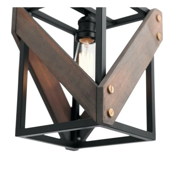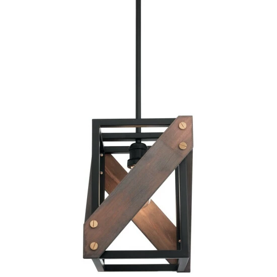 This Fulton Cross collection 1-light pendant features a black finish that will complement many lodge, country, and rustic decors. The clean lines of steel frame and contrasting wood colored accents add interest while giving a unique look to the light.