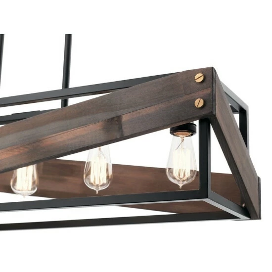 This Fulton Cross collection 5-light linear chandelier features a black finish that will complement many lodge, country, and rustic decors. The clean lines of steel frame and contrasting stained wood accents add interest while giving a unique look to the light.