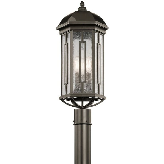 This Galemore collection 3-light outdoor post lantern features an olde bronze finish that will complement many traditional decors. Clean lines of the aluminum frame add interest while the seeded glass panels gives your outdoor decor a whole new look. The Galemore outdoor collection offers stamped metal detail and seeded glass for a traditional look. It features a classic scroll atop the fixture and extended open cage work at the bottom. Dimensions: 23 inches high x 9.5 inch diameter.