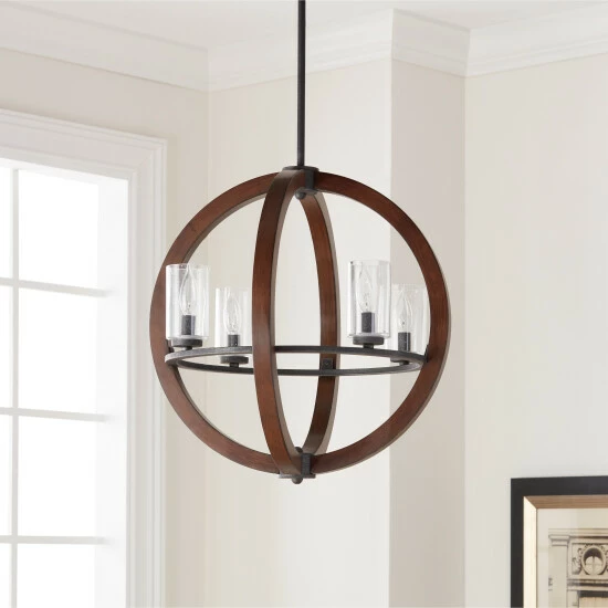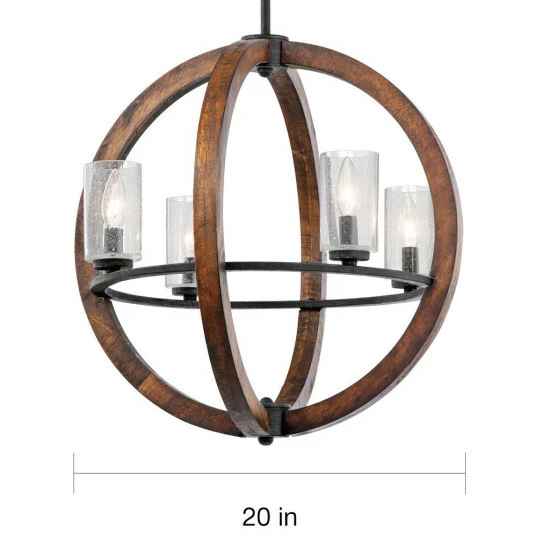 This 4-light chandelier from the Grand Bank collection features an auburn stained finish that will complement many lodge, loft, country, and rustic decors. The clear seedy glass shades set inside the sphere designed frame will add interest to any space. This piece includes 36 inches of chain and 74 inches of wire so it can be hung at your desired height. Dimensions: Up to 60 inches high x 20 inch diameter. Turn on our fixtures, and watch your room transform even more. From lighting to ceiling fans Kichler collections are built around our simple philosophy of bringing you the effect you want for your home or business. Our collections coordinate from room-to-room, or let you mix and match from wall-to-ceiling. And each fixture is designed to deliver a stunning quality of light that makes your space more beautiful and more livable. As one of the largest, privately held residential lighting fixture companies in North America, we’re constantly working to create innovative and on-trend decorative products as well as knowledgeable support. Since 1938, we’ve been creating products that are not only well designed, but also practical. We invest millions of dollars each year in design, technology and testing to assure that we’re offering distributors, designers, installers and homeowners not only innovative technologies – but also fixtures that perform efficiently, install intuitively and deliver a premium source of light. This philosophy holds true for everything we create – from our wide variety of decorative fixtures to our award-winning landscape lighting to our ceiling fans.