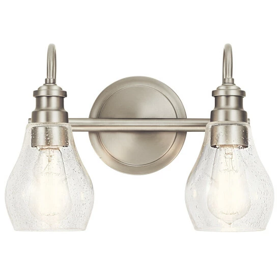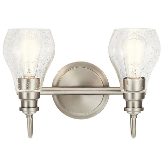 An updated twist on a popular vanity lighting style, this Greenbrier collection 2 light bath light’s teardrop-shaped shades feature clear seeded glass for added visual interest. Tailored and subtly detailed arms in a brilliant Nickel finish bring a sophisticated feel.