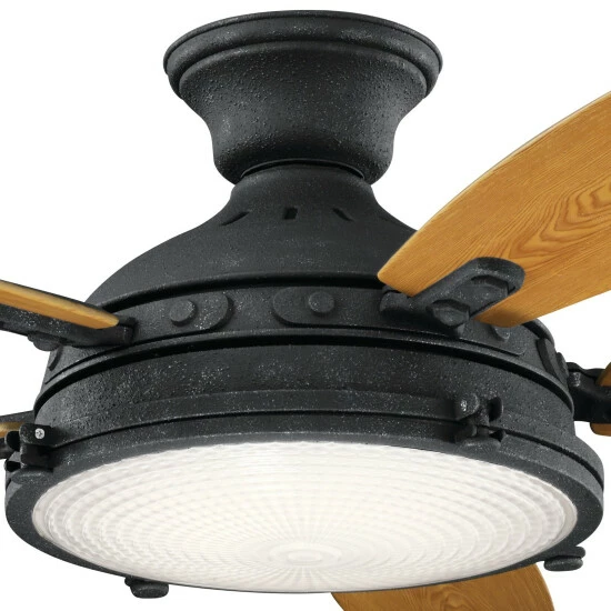 This unique 52 inch Hatteras Bay fan makes a distinctive statement with its Distressed Black finish and Fresnel lens featuring layered Clear and Gloss White Glass.