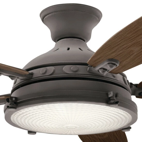 This unique 52 inch Hatteras Bay fan makes a distinctive statement with its Weathered Zinc finish and Fresnel lens featuring layered Clear and Gloss White Glass.