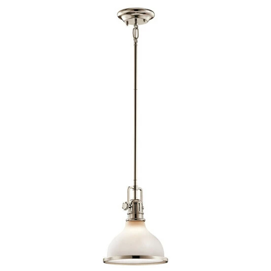 This Hatteras Bay collection 1-light mini pendant features a polished nickel finish that will complement many transitional decors. The clean lines of the steel frame add interest while the Fresnel lens provides ample lighting to any space. This mini pendant from the Hatteras Bay(TM) collection is a charming accent piece that will complement any space. Featuring a rich, polished nickel finish and a white glass bowl with an inside etched clear Fresnel lens, this design is sure to leave an impression. This piece includes 36 inches of stems and 70 inches of wire so it can be hung at your desired height (Up to 48 inches). Dimensions: 10.25 inches high x 8 inch diameter. Turn on our fixtures, and watch your room transform even more. From lighting to ceiling fans Kichler collections are built around our simple philosophy of bringing you the effect you want for your home or business. Our collections coordinate from room-to-room, or let you mix and match from wall-to-ceiling. And each fixture is designed to deliver a stunning quality of light that makes your space more beautiful and more livable. As one of the largest, privately held residential lighting fixture companies in North America, we’re constantly working to create innovative and on-trend decorative products as well as knowledgeable support. Since 1938, we’ve been creating products that are not only well designed, but also practical. We invest millions of dollars each year in design, technology and testing to assure that we’re offering distributors, designers, installers and homeowners not only innovative technologies – but also fixtures that perform efficiently, install intuitively and deliver a premium source of light. This philosophy holds true for everything we create – from our wide variety of decorative fixtures to our award-winning landscape lighting to our ceiling fans.