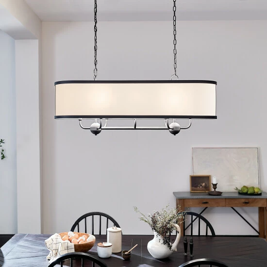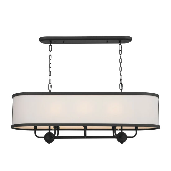 Transform your space to cozy and inviting with the Heddle collection. Designed to exude elegance and warmth, Heddle features refined vintage finishes, white linen shades, and exquisite artistic details. The Heddle 8 light linear chandelier creates a cozy, warm ambiance. Its soft fabric shade with a Textured Black trim matches its Textured Black finish. Just below the candle sleeve, you’ll see a ribbed spherical piece and a light floral detail on its body. Its these delicate design details that elevate its vintage aesthetic.