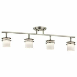 This 4-light rail light features a brushed nickel finish that will complement many contemporary and modern decors throughout your home. The clean lines of the steel frame add interest while the satin etched glass shades soften the light. Dimensions: 8.25 inches high x 30 inches wide x 5 inches deep. Turn on our fixtures, and watch your room transform even more. From lighting to ceiling fans Kichler collections are built around our simple philosophy of bringing you the effect you want for your home or business. Our collections coordinate from room-to-room, or let you mix and match from wall-to-ceiling. And each fixture is designed to deliver a stunning quality of light that makes your space more beautiful and more livable. As one of the largest, privately held residential lighting fixture companies in North America, we’re constantly working to create innovative and on-trend decorative products as well as knowledgeable support. Since 1938, we’ve been creating products that are not only well designed, but also practical. We invest millions of dollars each year in design, technology and testing to assure that we’re offering distributors, designers, installers and homeowners not only innovative technologies – but also fixtures that perform efficiently, install intuitively and deliver a premium source of light. This philosophy holds true for everything we create – from our wide variety of decorative fixtures to our award-winning landscape lighting to our ceiling fans.
