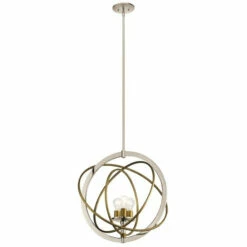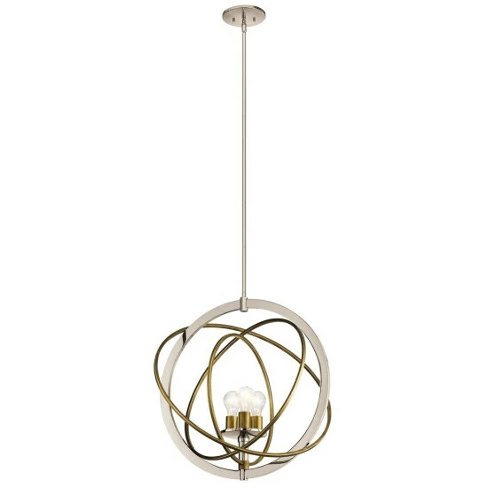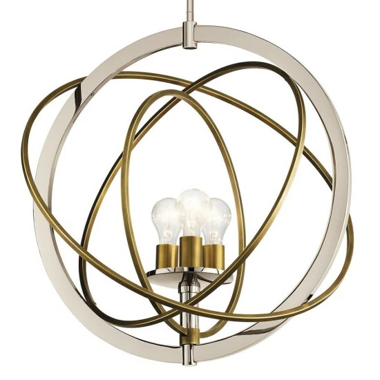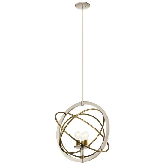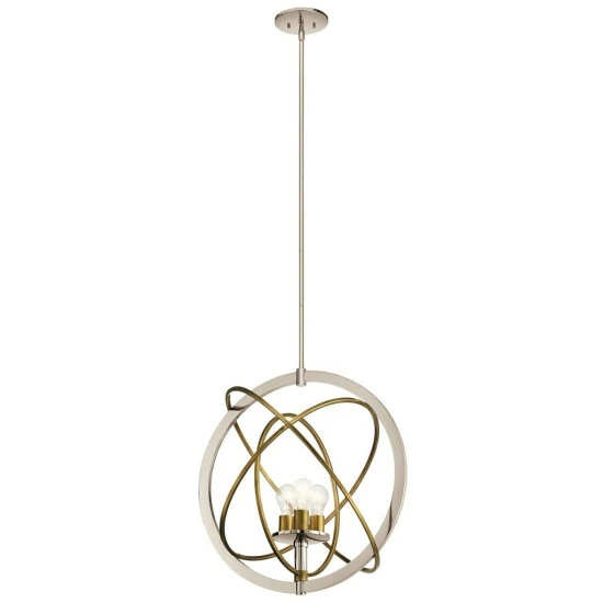 This Ibis collection 3-light pendant features a polished nickel finish that will complement many contemporary decors throughout your home. The clean lines of the steel frame and contrasting natural brass rings add interest while the exposed bulbs provide ample light to many spaces. The pendant from the Ibis collection invites you to have a little fun with your style. The inner rings are adjustable, allowing you to move them as the mood strikes: line them up for a linear look or arrange them in a more galactic interpretation. The two-tone polished nickel and natural brass finish assures your customized piece works against a variety of backdrops.