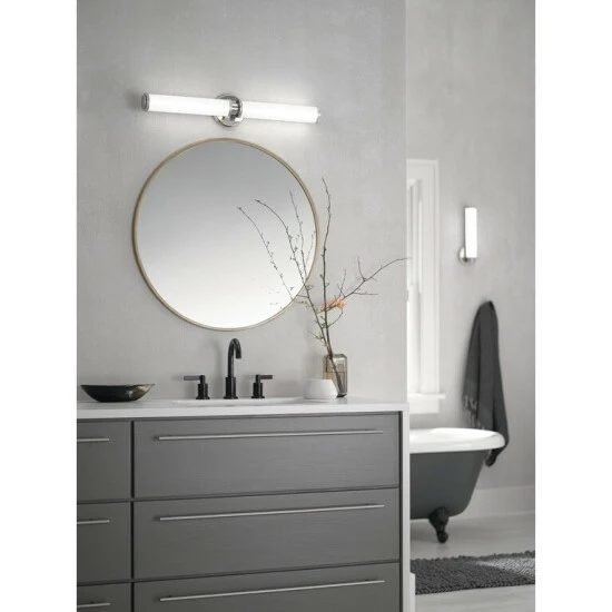 This Indeco collection 27-inch LED linear bath/vanity bar features a polished nickel finish that will complement many transitional and modern decors. The clean, white satin etched glass softens the light creating an inviting atmosphere for any space. Inspired by the diamond knurl pattern that’s common in hardware, this Indeco linear bath light in polished nickel combines classic lines with mechanical touches. Designed to hang either vertically or horizontally over a bathroom vanity the vintage industrial look also works well in any modern room: flank a dining room mirror, illuminate artwork or add sconces down a hallway. The energy efficient integrated LED projects a soft, white light that keeps colors in their natural state. The 1915 delivered Lumens is equivalent to around a 125 W Incandescent bulb. Dimensions: 5 inches high x 27 inches wide x 3.75 inches deep.