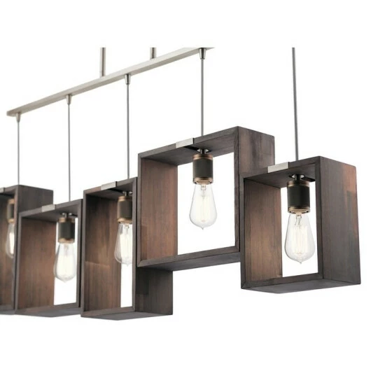This Industrial Frames collection 5-light linear chandelier features a classic pewter finish that will complement many lodge, country, and rustic decors. The clean lines of steel and wood frame add interest while the exposed bulbs provide ample light making this piece perfect for many spaces.
