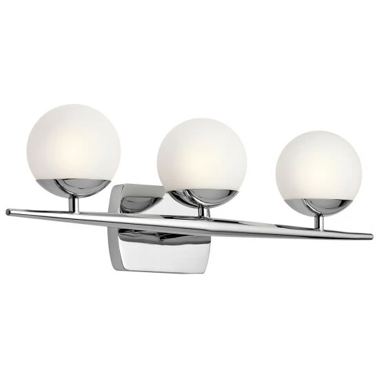 This Jasper collection 3-light halogen bath/vanity light features a chrome finish that will complement many contemporary and modern decors. Satin etched cased opal glass globes add interest while softening the light and completing this unique design. This 3 light halogen bath light from the Mid-Century Modern Jasper collection features a gently tapered bar with satin etched cased opal globes nestled on polished chrome accents. Dimensions: 7.75 inches high x 24.5 inches wide x 6 inches deep. Turn on our fixtures, and watch your room transform even more. From lighting to ceiling fans Kichler collections are built around our simple philosophy of bringing you the effect you want for your home or business. Our collections coordinate from room-to-room, or let you mix and match from wall-to-ceiling. And each fixture is designed to deliver a stunning quality of light that makes your space more beautiful and more livable. As one of the largest, privately held residential lighting fixture companies in North America, we’re constantly working to create innovative and on-trend decorative products as well as knowledgeable support. Since 1938, we’ve been creating products that are not only well designed, but also practical. We invest millions of dollars each year in design, technology and testing to assure that we’re offering distributors, designers, installers and homeowners not only innovative technologies – but also fixtures that perform efficiently, install intuitively and deliver a premium source of light. This philosophy holds true for everything we create – from our wide variety of decorative fixtures to our award-winning landscape lighting to our ceiling fans.
