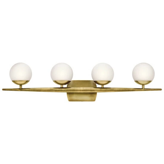 This Jasper collection 4-light halogen bath/vanity light features a natural brass finish that will complement many contemporary and modern decors. Satin etched cased opal glass globes add interest while softening the light and completing this unique design. This halogen bath light from the Mid-Century Modern Jasper collection features a gently tapered bar with satin etched cased opal globes nestled on natural brass accents. Dimensions: 7.5 inches high x 32.25 inches wide x 6 inches deep. Turn on our fixtures, and watch your room transform even more. From lighting to ceiling fans Kichler collections are built around our simple philosophy of bringing you the effect you want for your home or business. Our collections coordinate from room-to-room, or let you mix and match from wall-to-ceiling. And each fixture is designed to deliver a stunning quality of light that makes your space more beautiful and more livable. As one of the largest, privately held residential lighting fixture companies in North America, we’re constantly working to create innovative and on-trend decorative products as well as knowledgeable support. Since 1938, we’ve been creating products that are not only well designed, but also practical. We invest millions of dollars each year in design, technology and testing to assure that we’re offering distributors, designers, installers and homeowners not only innovative technologies – but also fixtures that perform efficiently, install intuitively and deliver a premium source of light. This philosophy holds true for everything we create – from our wide variety of decorative fixtures to our award-winning landscape lighting to our ceiling fans.