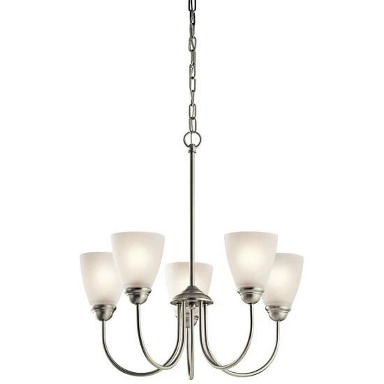 This Jolie collection 5-light LED chandelier features a brushed nickel finish that will complement many transitional decors. Clean lines of the steel frame add interest while the satin etched glass shades soften the light to create an inviting atmosphere. Enjoy the splendor of this pendant from the refreshing Jolie collection. The clean lines are beautifully accented by satin etched glass. Jolie is the perfect transitional style for a variety of homes. This piece includes 36 inches of chain and 39 inches of wire so it can be hung at your desired height (Up to 57 inches). Dimensions: 18.5 inches high x 22 inch diameter. Turn on our fixtures, and watch your room transform even more. From lighting to ceiling fans Kichler collections are built around our simple philosophy of bringing you the effect you want for your home or business. Our collections coordinate from room-to-room, or let you mix and match from wall-to-ceiling. And each fixture is designed to deliver a stunning quality of light that makes your space more beautiful and more livable. As one of the largest, privately held residential lighting fixture companies in North America, we’re constantly working to create innovative and on-trend decorative products as well as knowledgeable support. Since 1938, we’ve been creating products that are not only well designed, but also practical. We invest millions of dollars each year in design, technology and testing to assure that we’re offering distributors, designers, installers and homeowners not only innovative technologies – but also fixtures that perform efficiently, install intuitively and deliver a premium source of light. This philosophy holds true for everything we create – from our wide variety of decorative fixtures to our award-winning landscape lighting to our ceiling fans.