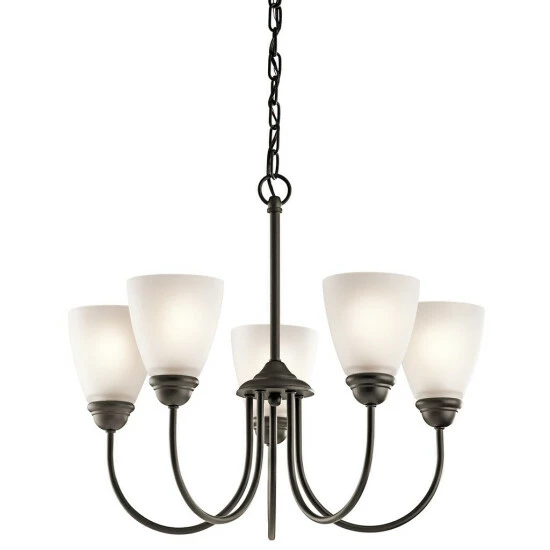 This Jolie collection 5-light LED chandelier features an olde bronze finish that will complement many transitional decors. Clean lines of the steel frame add interest while the satin etched glass shades soften the light to create an inviting atmosphere. Enjoy the splendor of this pendant from the refreshing Jolie collection. The clean lines are beautifully accented by satin etched glass. Jolie is the perfect transitional style for a variety of homes. This piece includes 36 inches of chain and 39 inches of wire so it can be hung at your desired height (Up to 57 inches). Dimensions: 18.5 inches high x 22 inch diameter. Turn on our fixtures, and watch your room transform even more. From lighting to ceiling fans Kichler collections are built around our simple philosophy of bringing you the effect you want for your home or business. Our collections coordinate from room-to-room, or let you mix and match from wall-to-ceiling. And each fixture is designed to deliver a stunning quality of light that makes your space more beautiful and more livable. As one of the largest, privately held residential lighting fixture companies in North America, we’re constantly working to create innovative and on-trend decorative products as well as knowledgeable support. Since 1938, we’ve been creating products that are not only well designed, but also practical. We invest millions of dollars each year in design, technology and testing to assure that we’re offering distributors, designers, installers and homeowners not only innovative technologies – but also fixtures that perform efficiently, install intuitively and deliver a premium source of light. This philosophy holds true for everything we create – from our wide variety of decorative fixtures to our award-winning landscape lighting to our ceiling fans.