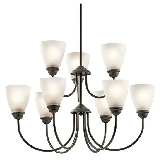 This Jolie collection 9-light, 2-tier LED chandelier features an olde bronze finish that will complement many transitional decors. Clean lines of the frame add interest while satin etched glass shades soften the light to create an inviting atmosphere. Enjoy the splendor of this pendant from the refreshing Jolie collection. The clean lines are beautifully accented by satin etched glass. Jolie is the perfect transitional style for a variety of homes. This piece includes 36 inches of chain and 39 inches of wire so it can be hung at your desired height (Up to 66 inches). Dimensions: 28 inches high x 28 inch diameter. Turn on our fixtures, and watch your room transform even more. From lighting to ceiling fans Kichler collections are built around our simple philosophy of bringing you the effect you want for your home or business. Our collections coordinate from room-to-room, or let you mix and match from wall-to-ceiling. And each fixture is designed to deliver a stunning quality of light that makes your space more beautiful and more livable. As one of the largest, privately held residential lighting fixture companies in North America, we’re constantly working to create innovative and on-trend decorative products as well as knowledgeable support. Since 1938, we’ve been creating products that are not only well designed, but also practical. We invest millions of dollars each year in design, technology and testing to assure that we’re offering distributors, designers, installers and homeowners not only innovative technologies – but also fixtures that perform efficiently, install intuitively and deliver a premium source of light. This philosophy holds true for everything we create – from our wide variety of decorative fixtures to our award-winning landscape lighting to our ceiling fans.
