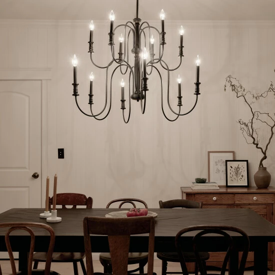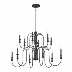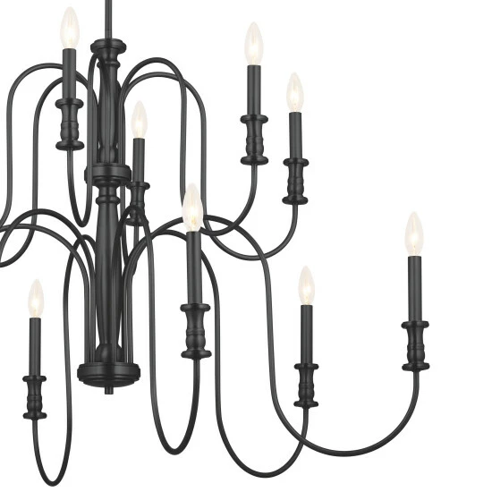Light, airy and refined, the Karthe collection celebrates turned elements and a nod to heirloom quality details. Karthe is classic and brings casual elegance into your home.Β Sweeping arms keep this Karthe 2-tier 12 light chandelier light and airy. Its Black finish beautifully shows off the turned spindle details. Illuminate your space with its casual elegance.