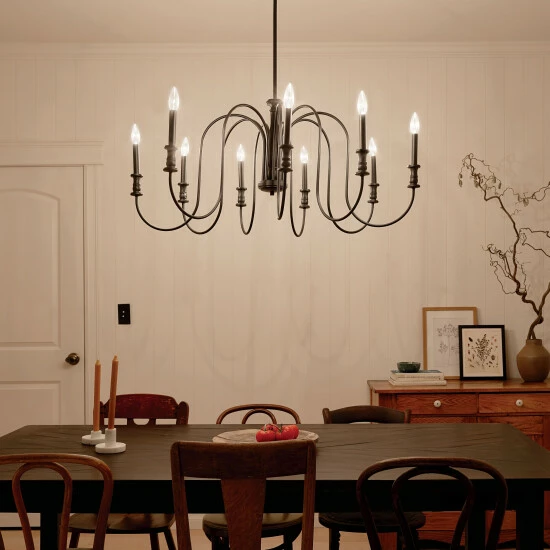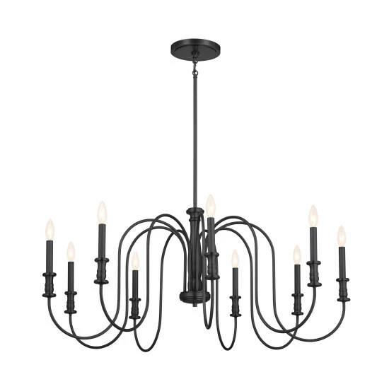 Light, airy and refined, the Karthe collection celebrates turned elements and a nod to heirloom quality details. Karthe is classic and brings casual elegance into your home.Β Sweeping arms keep this Karthe 9 light chandelier light and airy. Its Black finish beautifully shows off the turned spindle details. Illuminate your space with its casual elegance.