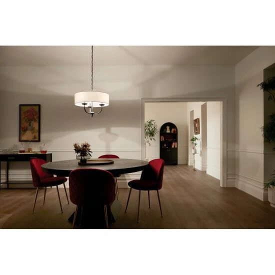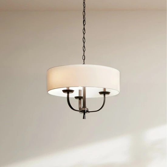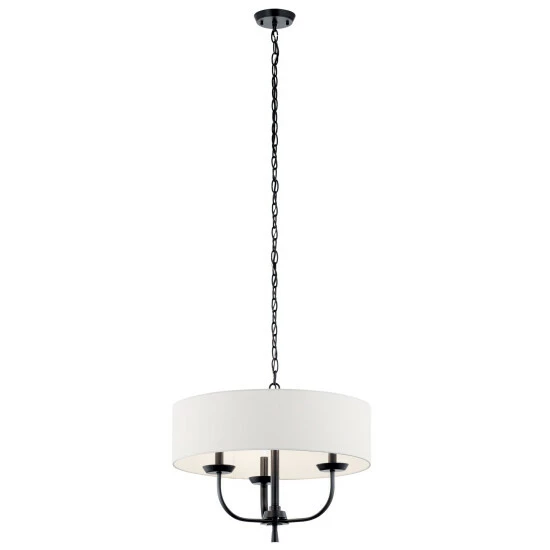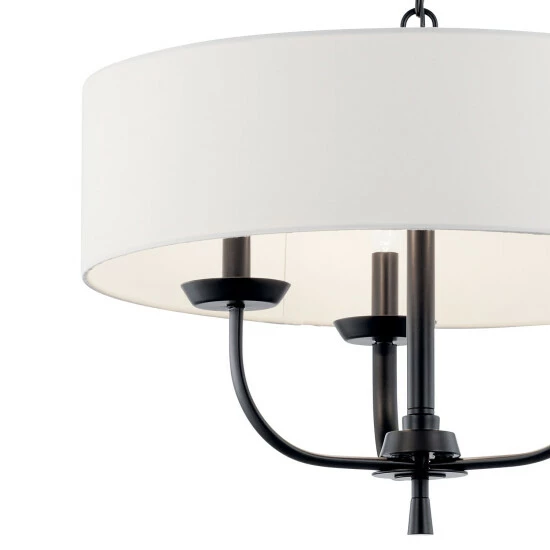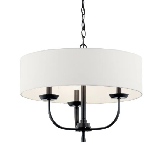 Sprinkling nostalgia into the present day is what the Kennewick collection is all about. It features classic silhouettes and gentle curves for a sophistication all its own. The Kennewick 3 light chandelier updates the traditional candelabra with its single, curved fabric shade in crisp white. The Black finish nods to the contemporary and makes this chandelier ideal for the updated traditional home.