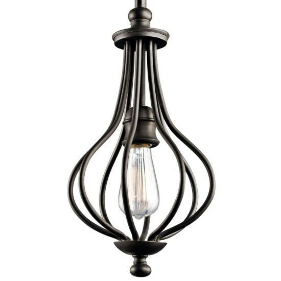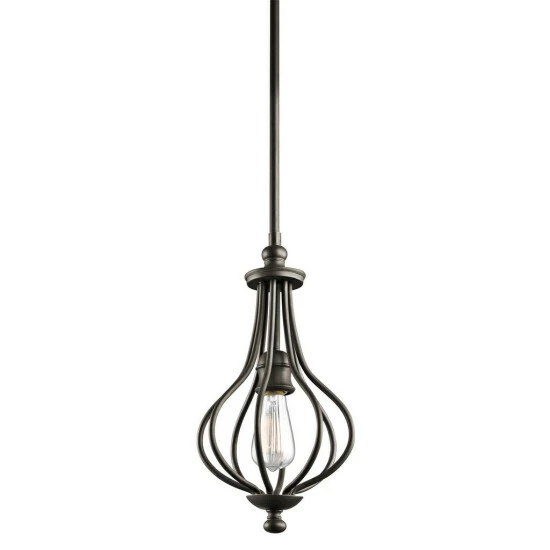 This Kensington collection 1-light mini pendant features an olde bronze finish that will complement many lodge, country, and rustic decors. The vintage birdcage shape surrounding the exposed bulb adds interest and completes this unique design. You can scour antique stores for that perfect vintage birdcage…or you can add a touch of that style when you bring this mini pendant from the Kensington(TM) collection home. Slender ironwork ebbs and flows in an olde bronze(R) finish, creating an elegant interpretation of a decorating classic.