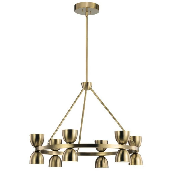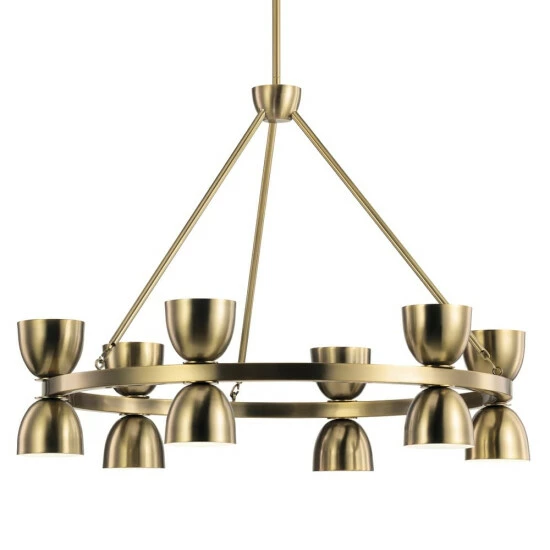 The Baland 31 inch 12 light chandelier features ceramic-inspired cups in Brushed Natural Brass. Five cups face up, and five face down, creating both direct and indirect light. Far from routine, this chandelier is the centerpiece of your space.Modern and mid-century modern spaces offer the ideal backdrop for a Baland chandelier.An iconic American style, mid-century modern promotes smooth curves, straight lines, and simple contemporary elegance. With its tea cup-shaped cups, facing both up and down, the BalandΒ chandelier is the crown jewel of the mid-century modern space.The Baland chandelier includes multiple stems, allowing you to choose the length ideal for your space.