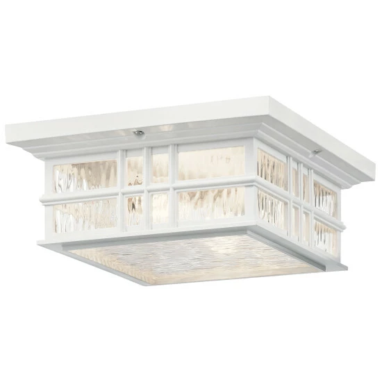 Inspired by classic craftsman architecture, this 2-light outdoor ceiling light has clean lines deliver a transitional and versatile style. Each fixture is designed to withstand harsh outdoor elements, like saltwater spray and UV rays, for a beautiful and long-lasting White finish. The clear, hammered glass simulates the look of water, enhancing the overall style, while still letting the light shine through.