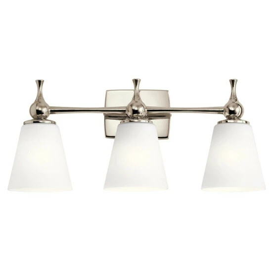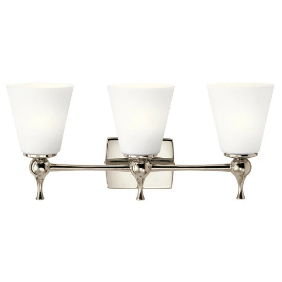 The Cosabella 24 inch 3 light vanity light embodies Mid-Century modern minimalism. The Satin Etched Case Opal shades soften the light to a luxurious glow. The Polished Nickel cinched stem extends beyond the wall plate to hold the second and third lights, and both the shades and wall plate curve delicately to help make your home an oasis of calm enjoyment.Simple and soft, this collection was designed with soft contemporary and Mid-Century modern dΓ©cor in mind but is versatile enough to work with nearly all other styles.The Polished Nickel wall plate is behind only one of the lights, the other lights held out by a Polished Nickel cinched stem. This simple detail reflects the minimalism design that makes this fixture so stunning.The etched glass shades soften the lights to create a gentle glow, and their clean white color is characteristic of contemporary design.