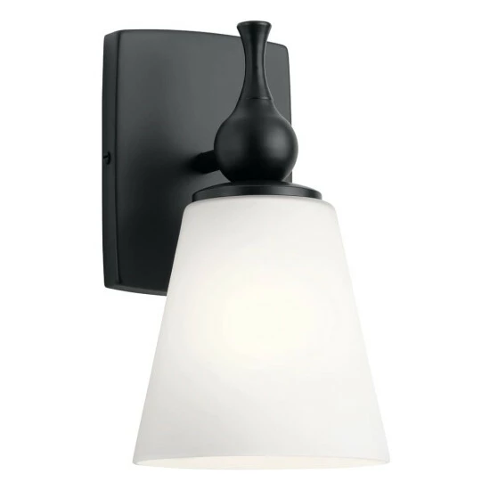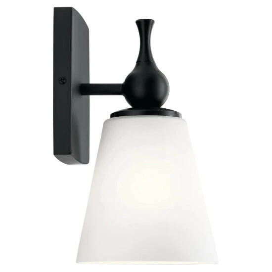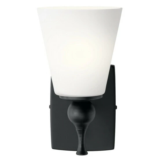 The Cosabella 6 inch 1 light wall sconce embodies Mid-Century modern minimalism. The Satin Etched Case Opal shade softens the light to a luxurious glow, as it hangs from a Black cinched stem. The shade and wall plate curve delicately. Make your home an oasis of calm, and enjoy.Simple and soft, this collection was designed with soft contemporary and Mid-Century modern dΓ©cor in mind but is versatile enough to work with nearly all other styles.The etched glass shade softens the light to create a gentle glow, and its clean white color is characteristic of contemporary design.