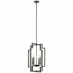 The Downtown Deco 25 inch 4 light large foyer pendant in Midnight Chrome features a squared edge outer frame that surrounds the curved candle design, allowing the light to fully shine through. The Downtown Deco foyer pendant is perfect in contemporary or mid-century modern environments. Add allure with this modern take on a classic style that integrates well in traditional or contemporary dΓ©cor. The Downtown Deco 4 light large foyer pendant in Midnight Chrome finish boasts an eye-catching silhouette with a blend of classic charm and contemporary design. Measuring 18 inches wide and 25 inches tall, this fixture features a squared edge open framework that provides ample ambient light throughout your space. Place it in your foyer or dressing room to add an intriguing touch to your dΓ©cor. Customize for higher ceilings with 58 inches of extra lead wire. Complete the look with a 60 watt (max.) candelabra bulbs.