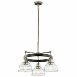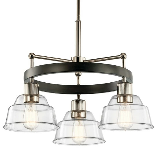 The Eastmont 3 light chandelier is undeniably remarkable. A Walnut Wood wagon wheel with Polished Nickel arms set the scene for the Clear Glass double-tiered shades, making this one of our most sophisticated and versatile fixtures. Blurring style lines, Eastmont can add sophistication to rustic or vintage space, and some edge to a simple, modern space.Nothing about the Eastmont chandelier is stagnant. Its double-tiered shades are Clear Glass, letting the bulbs shine through. To change up its look, simply change the bulbs β or get crazy and remove the glass entirely. To ensure the Eastmont is exactly as you wish, it comes with multiple stems for different lengths. You can also use a combination of stem and chain.