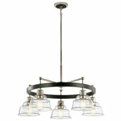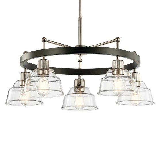 - The Eastmont 5 light chandelier features a Walnut Wood and Polished Nickel wagon wheel with double-tiered Clear Glass shades.