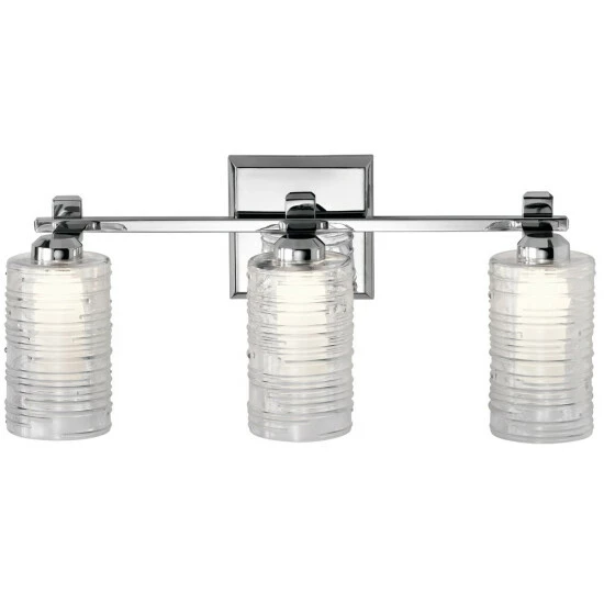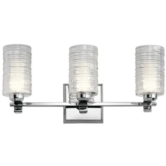 The GiarosaΒ 22.25 inch 3 light vanity light features two types of glass around each light: a Clear Hand-Spun Ribbed Outer Glass shade surrounds a Satin Etched Cased Opal Glass shade. It’s Chrome finish is the exclamation point on this exciting, contemporary fixture. The Giarosa collection flows beautifully with various contemporary design styles. The Hand-Spun Ribbed Outer Glass produces a hint of shadow play, adding to the fun in a way that doesn’t detract from giving you the light you’d want to illuminate your bathroom.Personalize your bathroom lighting by choosing the direction you want the light to go. Simply mount this vanity light facing up or down to achieve the effect you want.