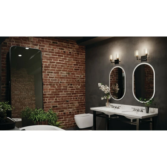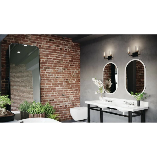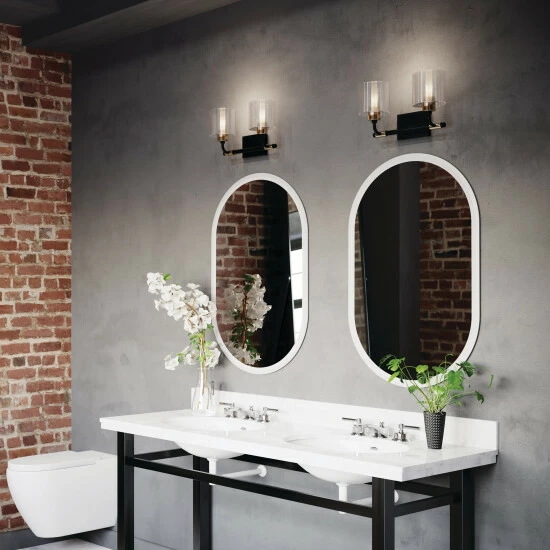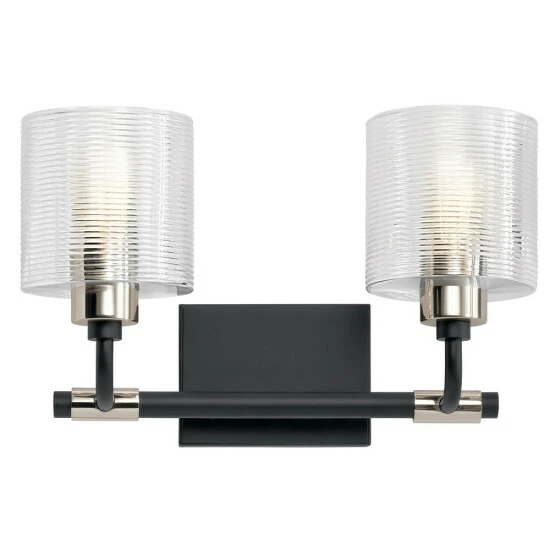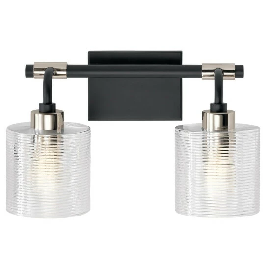 The Harvan 15 inch 2 light vanity light declares your refined industrial style. It’s Black finish stands out from the crowd, and its Polished Nickel accents add a dash of charisma. Not to be left out, the clear glass shade is ribbed, giving it added dimension. This light will make guests head to your bathroom just to check it out.Each fixture in the Harvan collection takes the industrial look and elevates to the refined.With its Black finish and Polished Nickel accents, this vanity light maintains the edgy industrial look but refines it just a touch. Mixed finishes are the hallmark of Industrial design dΓ©cor, and this fixture says you’re in it to win it.The first thing you notice about the Harvan collection is the Clear Ribbed Glass shade. An unexpectedly welcome detail, it owns its uniqueness. The ribbing doesn’t affect the light, so you still get the ambient lighting you’d want above your vanity mirror.