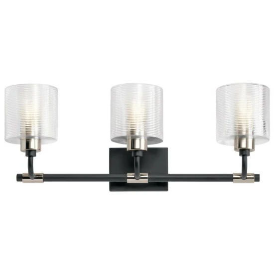 - The Harvan 25 inch 3 light vanity light features a Black finish, Polished Nickel accents, and Clear Ribbed Glass shade, giving it added dimension.
