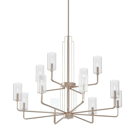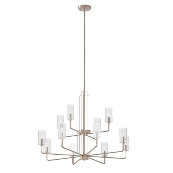 The Kimrose 12 light chandelier is an Art Deco masterpiece. Its geometric shapes take center stage in a gorgeous mix of Polished Nickel and Satin Nickel finishes. The shades are Clear Fluted Glass, meaning they’re ribbed gently with vertical grooves to produce a subtle lighting effect. For lighting without the effect, simply remove the shades.The unique lux Art Deco details of these carefully crafted Kimrose fixtures are sure to start a conversation.Featuring geometric shapes, this 12-light Kimrose chandelier exudes Art Deco design at its most luxurious. Its multiple rounded corners, gorgeous blend of Polished Nickel and Satin Nickel finishes, and fluted glass indulge the senses and beg for admiration.This chandelier is all about creating the look you want. It contains multiple stems for customizable lengths. You can also use a combination of stem and chain. Keep the fluted glass shades for a subtle lighting effect or remove them for a more natural lighting.