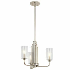 The Kimrose 3 light chandelier is an Art Deco masterpiece. Its geometric shapes take center stage in a gorgeous mix of Polished Nickel and Satin Nickel finishes. The shades are Clear Fluted Glass, meaning they’re ribbed gently with vertical grooves to produce a subtle lighting effect. For lighting without the effect, simply remove the shades.The unique lux Art Deco details of these carefully crafted Kimrose fixtures are sure to start a conversation.Featuring geometric shapes, this 3-light Kimrose chandelier exudes Art Deco design at its most luxurious. Its multiple rounded corners, gorgeous blend of Polished Nickel and Satin Nickel finishes, and fluted glass indulge the senses and beg for admiration.This chandelier is all about creating the look you want. It contains multiple stems for customizable lengths. You can also use a combination of stem and chain. Keep the fluted glass shades for a subtle lighting effect or remove them for a more natural lighting.
