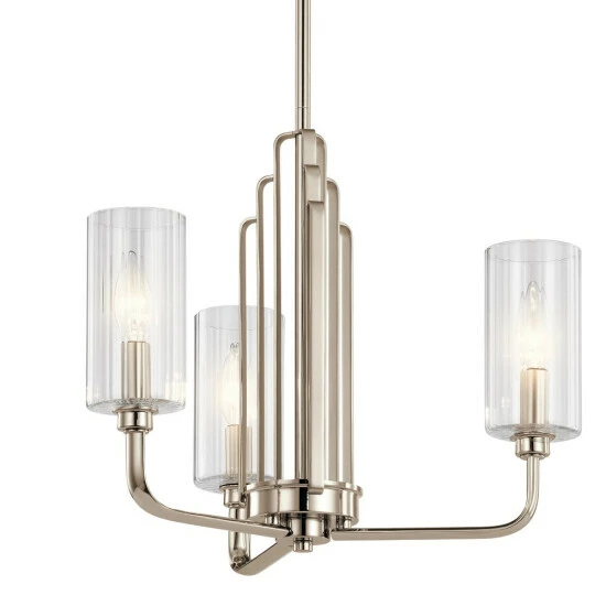 - The Kimrose 3 light chandelier features geometric shapes in a gorgeous mix of Polished Nickel and Satin Nickel finishes and removeable Clear Fluted Glass shades.