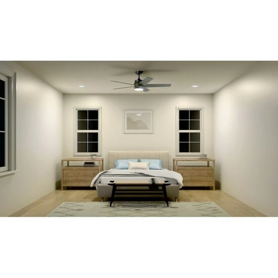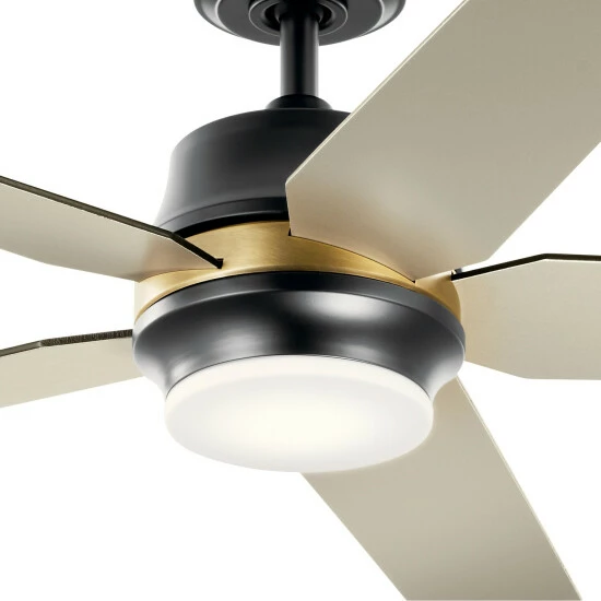 The Maeveβ’ 52 inch LED Ceiling Fan redefines simple sophistication. Covered in Satin Etched Cased Opal Glass, the integrated LED light gives you the efficiency and lighting you crave, while a Natural Brass accent ring adds a dash of dimension to the Satin Black body and blades. With clean lines and contemporary finishes, Maeve is the ideal focal point for transitional-styled rooms. As its plywood blades gently whirl, Maeve delivers an energy efficient light through its beautiful Satin Etched Cased Opal Glass. This ceiling fan reveals a subtle gap between the body’s base and the light. Influenced by the European design trend of adding a space between elements, Maeve brings simple sophistication as it balances contemporary and classic.