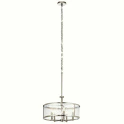 This brushed nickel finish five light pendant is part of the Marita collection. The clear wave glass shade provides ample illumination. Coordinate with other fixtures from the Marita collection for a dramatic look.