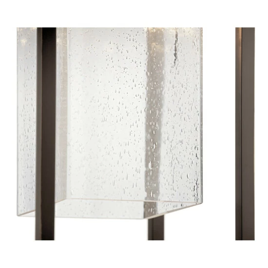 - Light directs down while the clear seeded glass creates a pattern on the exterior walls during the evening hours.