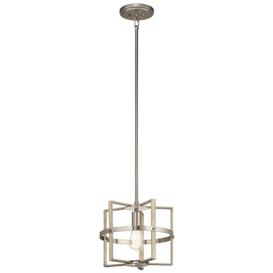 The popular industrial-inspired cage look gets a refreshing update with the Peyton collection 1 light pendant. Squared edges and lines, in a blend of whitewashed wood tones as well as polished and satin nickel metals, create a style that’s soft and modern.