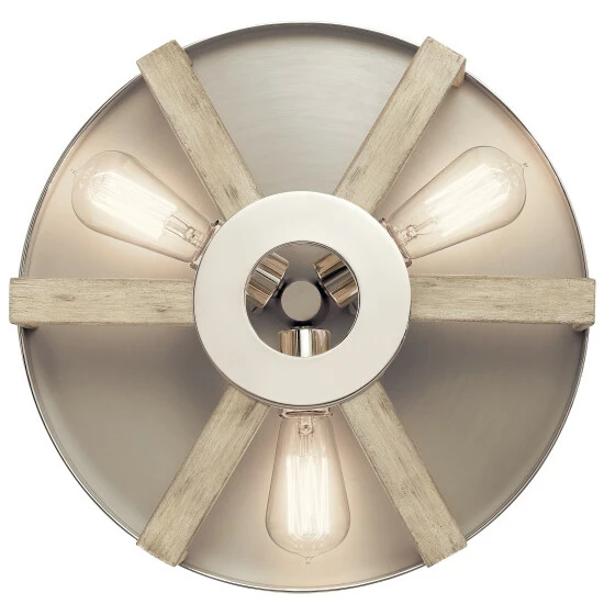 The popular industrial-inspired cage look gets a refreshing update with the Peyton collection 3 light flush mount. Squared edges and lines, in a blend of whitewashed wood tones as well as polished and satin nickel metals, create a style that’s soft and modern.