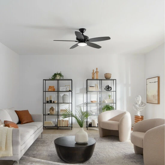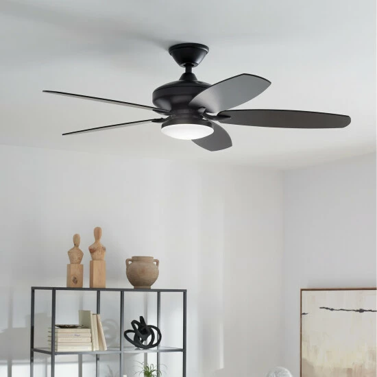 The Renew Designer 52 inch LED Ceiling Fan in a Satin Black finish easily integrates across multiple applications and dΓ©cor with its soft, modern design aesthetics. Inspired by the clean and simple design of a Nordic Vase it features a clean blade style, a larger than standard motor with no visible vents in the housing and an LED light kit
