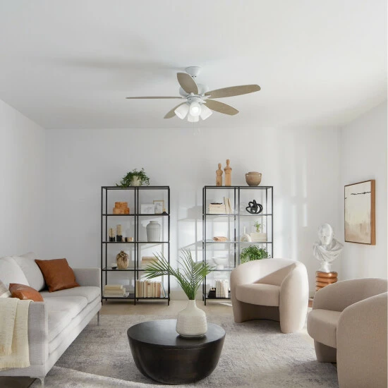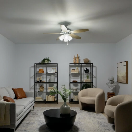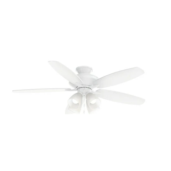 The Renew Premier 52 inch LED Ceiling Fan in a Matte White finish easily integrates across multiple applications and dΓ©cor with its soft, modern design aesthetics. Inspired by the clean and simple design of a Nordic Vase it features a clean blade style and a larger than standard motor with no visible vents in the housing. Plus, the uni-pack fan features 4-light fitter style LED kit (bulbs included) with updated barrel shaped glass in frosted white etched opal.