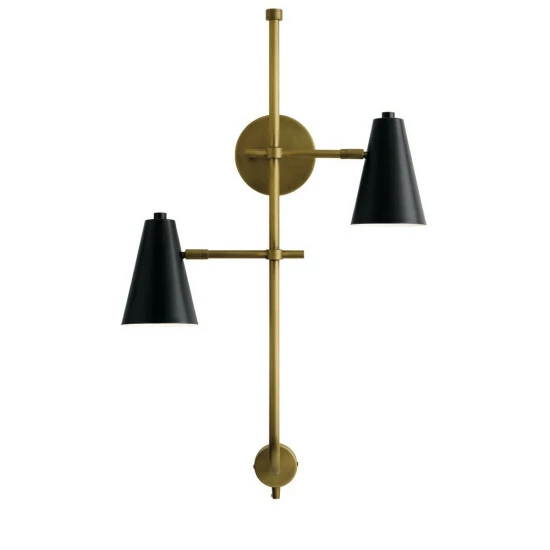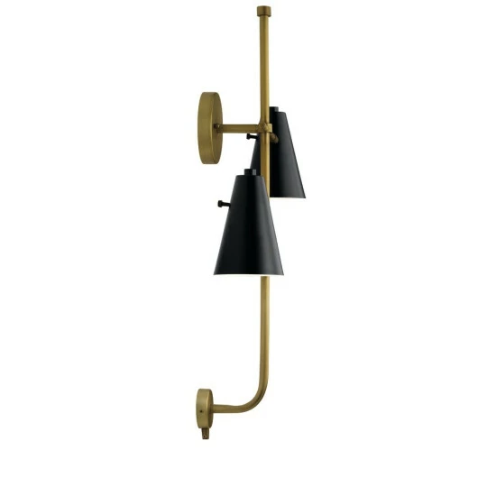 The Sylvia 2 light wall sconce makes a big impression in a soft voice. Each shade is Black with a White interior, has an on/off switch, and can swivel to direct light where you want. Straight arms extend away from pole in a Natural Brass finish, giving the entire fixture a luxurious feel. This luxe mid-century modern fixture is unique and exciting without being bold or brash.Sylvia wall sconce brings a quiet individuality to your space. Each shade can swivel, and each features individual on/off switches. You can choose to install the sconce by pinning and plugging it into the wall, or you can hardware it.